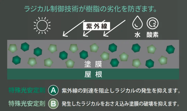 この2つの化学物質によるはたらきが協力し合うことでラジカルの発生を最低限に抑えられ、優れた耐候性を発揮するのです。
