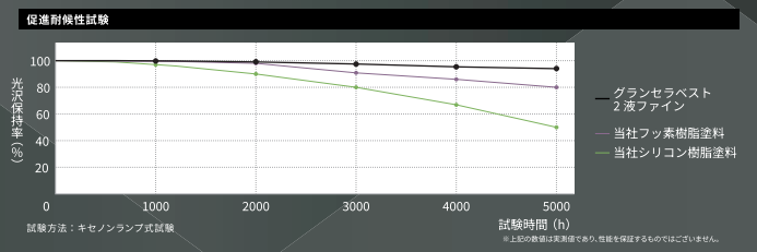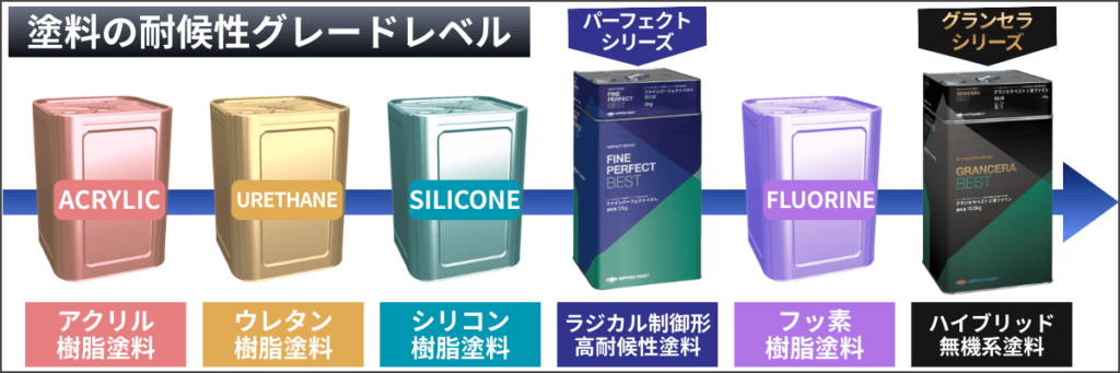 また、耐候性と塗料のグレードは比例するため、グランセラベスト2液ファインはラジカル塗料であるパーフェクトシリーズの塗料のさらに上をいく、最高峰のグレードを誇ります。