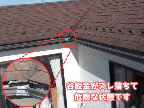 屋根と屋根が交わるV字部分を「谷」と呼び、ここに設置される「谷板金」は、四方からの雨水が集まるため、雨漏りの急所です。