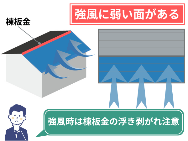 シンプルな形状のため、風圧の影響を受けやすい側面があります。特に強風時には、屋根の頂点にある棟板金(むねばんきん)が浮いたり、剥がれたりするリスクがあり、定期的な点検が必要です。
