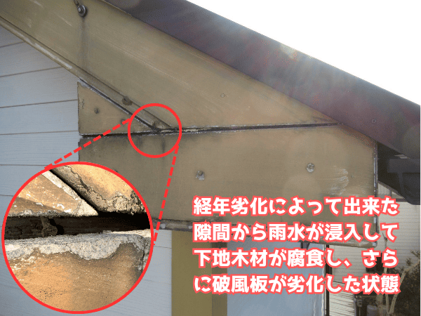 妻側(三角になっている部分の壁)にある「破風」や「ケラバ」は、軒が少ないため雨や紫外線の影響を受けやすく、劣化すると雨水の吸い込みにつながります。