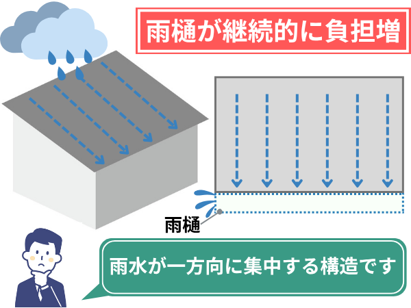 屋根の水がすべて一方向に流れるため、雨樋や外壁の一部に負担が集中しやすい構造です。