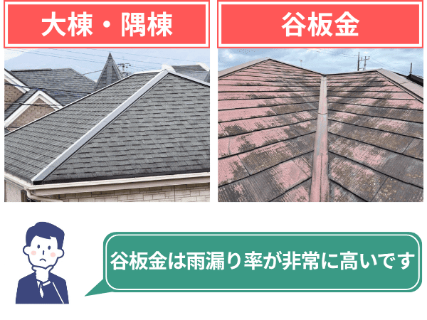 特に屋根の面同士が交わる「谷」の部分は、雨水やゴミが集まりやすく、雨漏りリスクが高くなる箇所です。