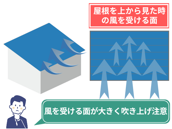 1枚の大きな屋根面が風上になると、風が屋根を押し上げる「吹き上げ」の力を受けやすく、強風時に屋根材が剥がれたり、棟板金が浮いたりするリスクが高いです。