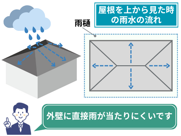 四方向すべてに軒(のき)があるため、外壁に直接雨が当たりにくく、外壁の汚れや劣化を防げます。