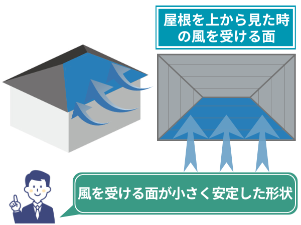 寄棟屋根は四方向すべてに屋根があるため、風を受け流すような形になっています。