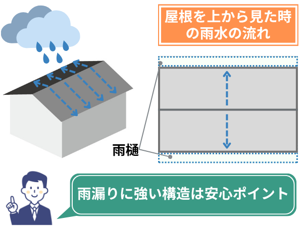 屋根の面が2つだけで谷(屋根の交差部分)がないため、雨水の排水性がとても良いです。