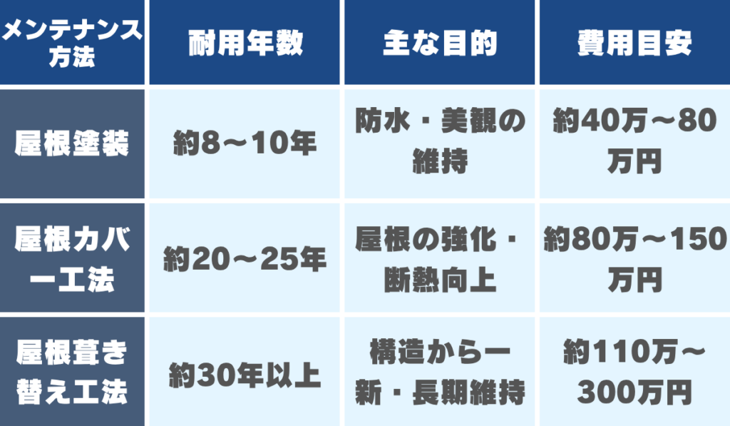 屋根をどう直すかは「この家をあとどのくらい維持したいか」で選び方が変わるのです。