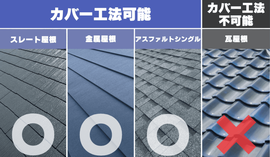 屋根カバー工法はすべての屋根に出来るわけではなく、屋根材の種類や状態によってカバー工法が出来ないものもあります。