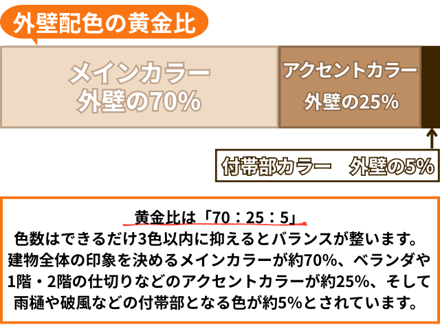 1. メインカラー(外壁の70%): 外壁のメインとなる色で家の印象を決める最も重要なカラー。