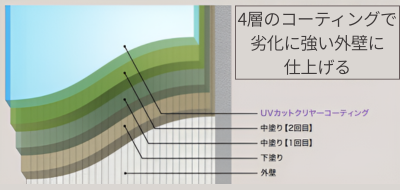 一般的な塗装とは異なり、紫外線に極めて強い外壁用高耐久・超親水性4層構造で外壁を守ることで、圧倒的な耐久性と美しさを実現します。