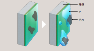 UVカットクリヤーコーティングの塗膜表面は超親水性性能を有しており、表面に汚れが付着した際には汚れの下に雨水が入り込み、雨が汚れを浮き上がらせて流し落とすことができます。