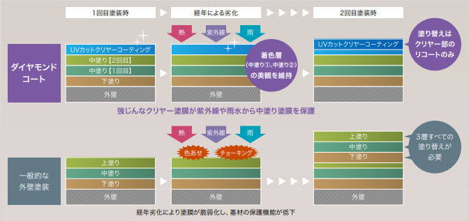 ダイヤモンドコートのクリヤー層は、日本ペイントがこの工法のために専用開発した樹脂を使用しています。