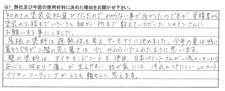 2013年施工当時F様から、ダイヤモンドコートをお選びいただいた理由について、日本ペイントさんが一流のメーカーという安心と何より「藻」が生えやすい我が家には、汚れのつきにくいUVカットクリヤーコーティングがとても頼もしく思えます。と回答していただきました。