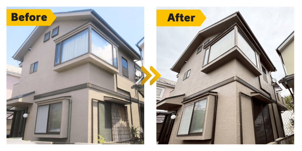 表面の緻密な塗膜のおかげで、雨筋汚れも軽微。高圧洗浄だけで当時の輝きが戻る状態でした。