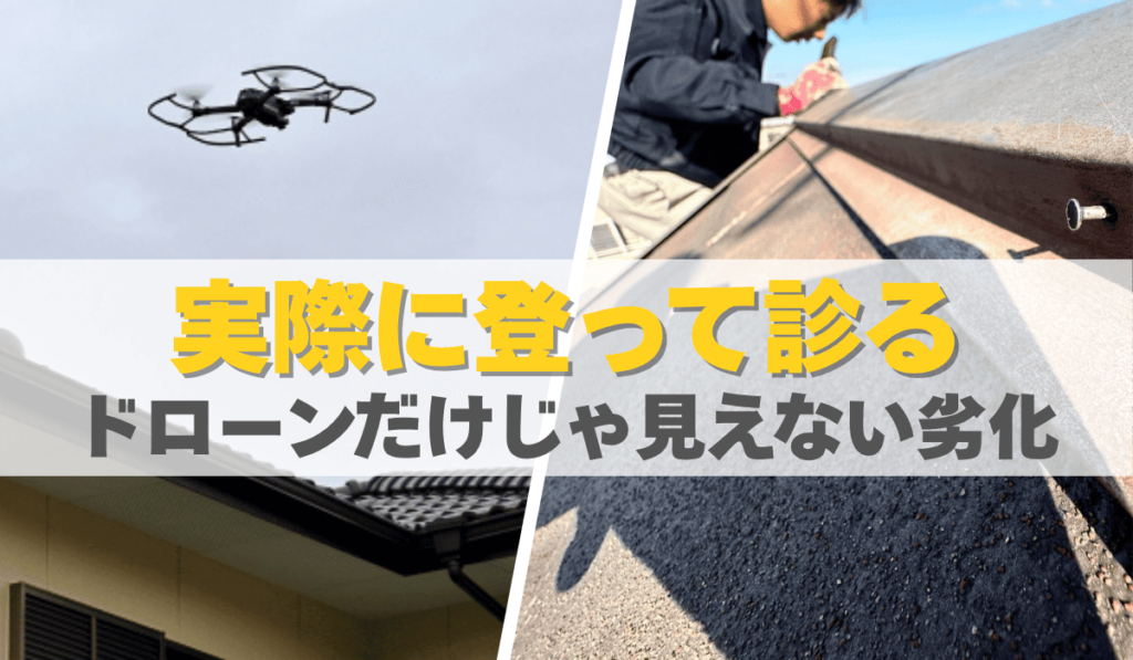 | 上空からの映像のみ。表面しか確認できない | 実際に屋根面に乗り、全体を目視‧手触りで確認 |