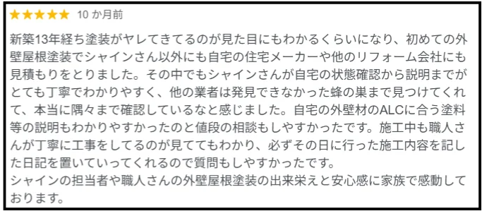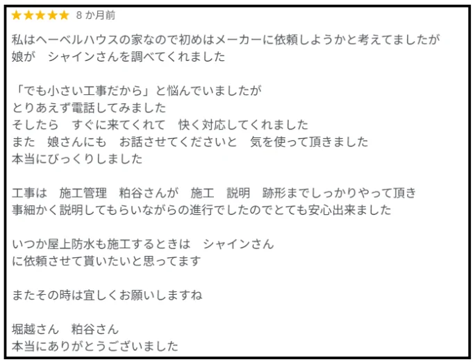 - 他社は建物全体一通りの工事費用の見積りに対し貴社だけはきちんと建物全体を点検してくれた
