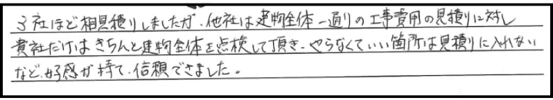 他社は建物全体一通りの工事費用の見積りに対し貴社だけはきちんと建物全体を点検してくれた