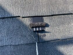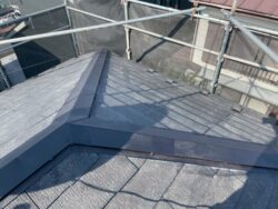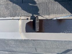棟板金に歪み、浮きが見られましたので打ち直しを行い、浮いている釘は再度打ち込んで釘頭にシーリング補修を行いました。