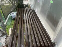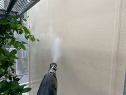 洗浄工程は、必要に応じて薬剤等も使用しながら約1日かけて行われます。経年によりこびりついた汚れをしっかりと除去していくことが、塗料の密着に繋がるからです。
