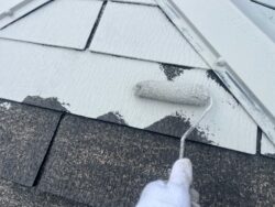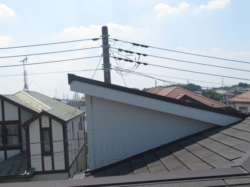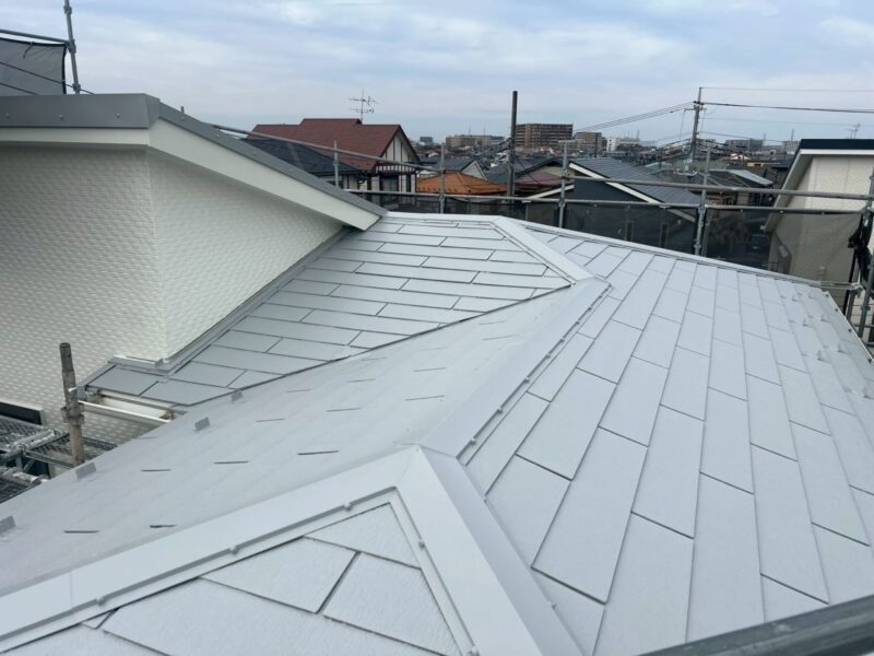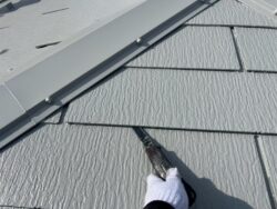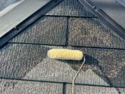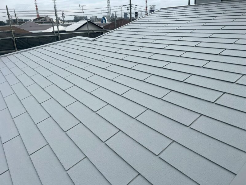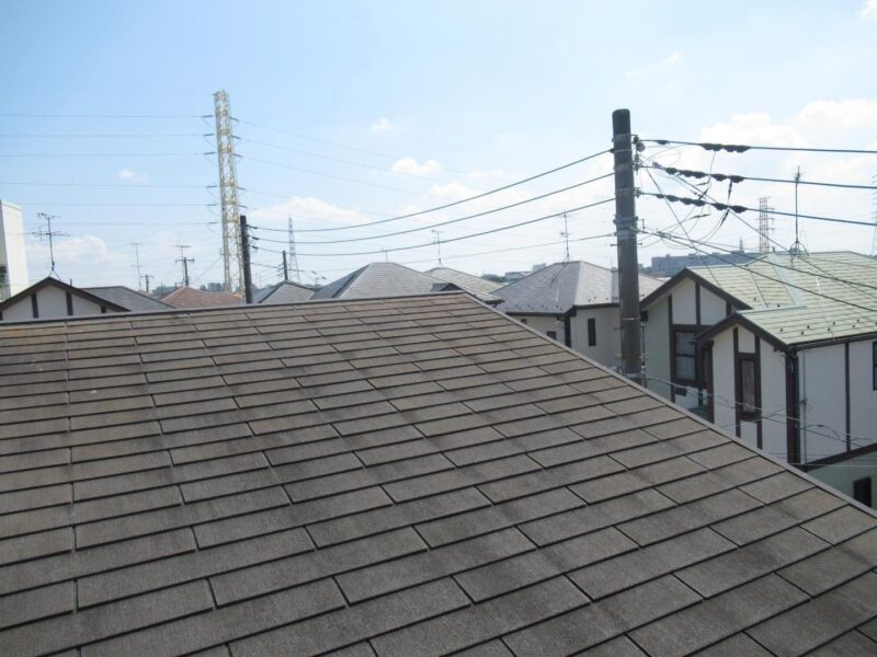 屋根はスレート屋根で、全体的に経年によるコケやカビなどが見られました。さらに棟板金の浮きやシーリングの劣化も進んでいたため、補修作業を行った後に遮熱塗料の「エシカルプロクールSi」にて塗装でのメンテナンスを行いました。