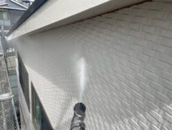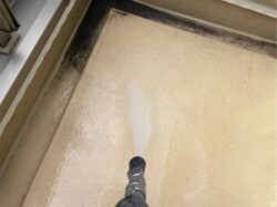 洗浄工程は、必要に応じて薬剤等も使用しながら約1日かけて行われます。経年によりこびりついた汚れをしっかりと除去していくことが、塗料の密着に繋がるからです。
