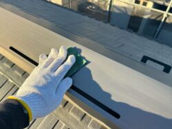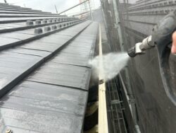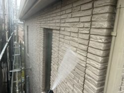 洗浄工程は、必要に応じて薬剤等も使用しながら約1日かけて行われます。経年によりこびりついた汚れをしっかりと除去していくことが、塗料の密着に繋がるからです。