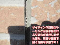 本来シーリング目地が「緩衝材」として働き、サイディングボードの動きを吸収しています。目地のシーリングが硬化・剥離すると、継ぎ目が動きやすくなり、ズレが発生しやすくなります。